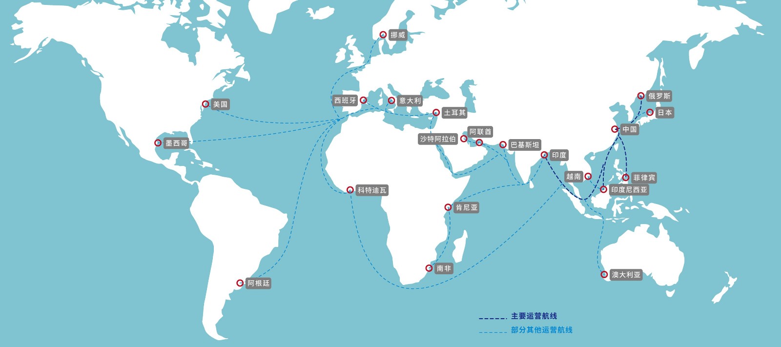拉斯维加斯官方网站的境外航区运输业务,涉及全球远洋无限航区,包括世界各国家及地区的开放港口和国际通航运河及河流,运输货物以煤炭、矿石、粮食、件杂等干散货为主。